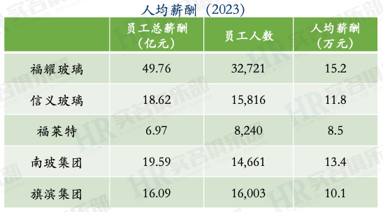 2023年,福耀玻璃人均薪酬15.2万,其次是南玻集团13.4万,信义玻璃和旗滨玻璃10-12万之间。